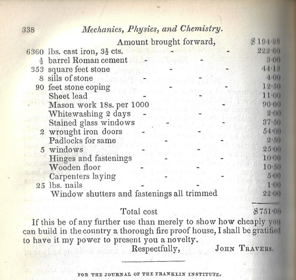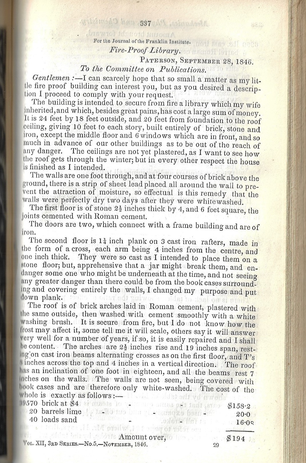 The fire-proof home was not much seen as a topic (so far as I can tell) in the early 20th century when Frank Lloyd Wright wrote about his proposal for one in the Ladies Home Journal in 1907. His design, outlined in "A Fireproof House for $5000") was an unusual subject then, and far more so since scholars say that this house of Wright's was never built as designed, appearing in a few iterations with stucco over wood, which of course is not fireproof. The article for a "Fire-Proof Library" appeared in September 1846 in the Journal of the Franklin Institute, written by a John Travers, who shared his plans for safely housing his wife's inherited library. The guy certainly was building a stout structure with massive walls, three tons of cast iron, cement, iron doors and window casements, stone, sheet lead, and 1.5"-thick wooden plank floors over cast iron trusses. How the wood figures to be "fire-proof" I do not know. But the subject was highly unusual, and decided to share the short article in full.