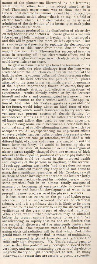 In January 1892, the 34-year-old Nikola Tesla gave an interesting and significant lecture on ("alternate currents of high potential and frequency") in London, first to the Royal Institution and second to the Institution of Electrical Engineers, which was summarized in this short paper in Nature (volume 45, #1163, 1892) reproduced below. This is a continuation it seems of his famous July 1891 lecture in which he first addressed his experiments with alternating current, and which gained him international attention. The full lecture may be seen at the Internet Archive: https://archive.org/details/ExperimentsWithAlternateCurTeslaNikola5098/page/n0