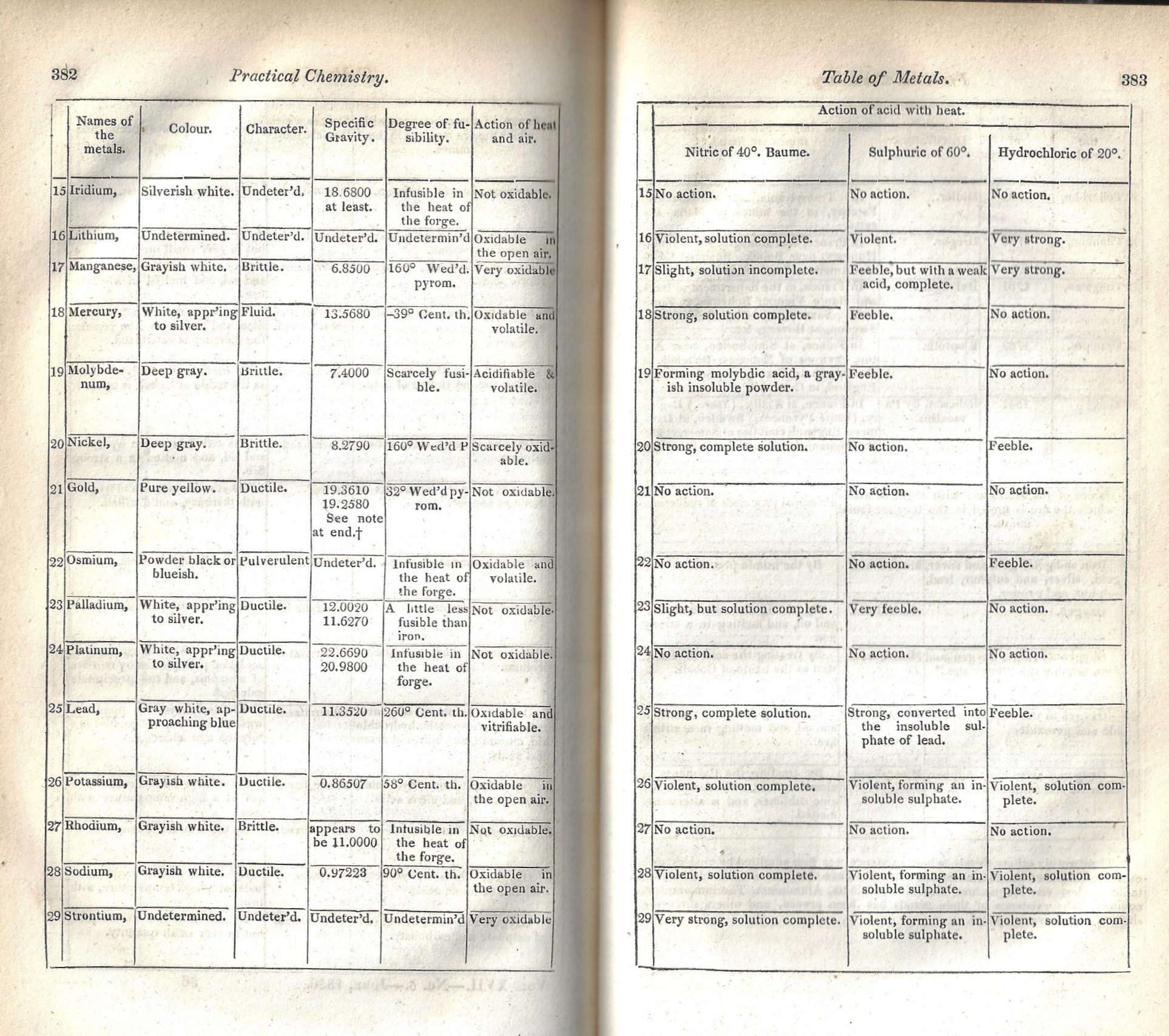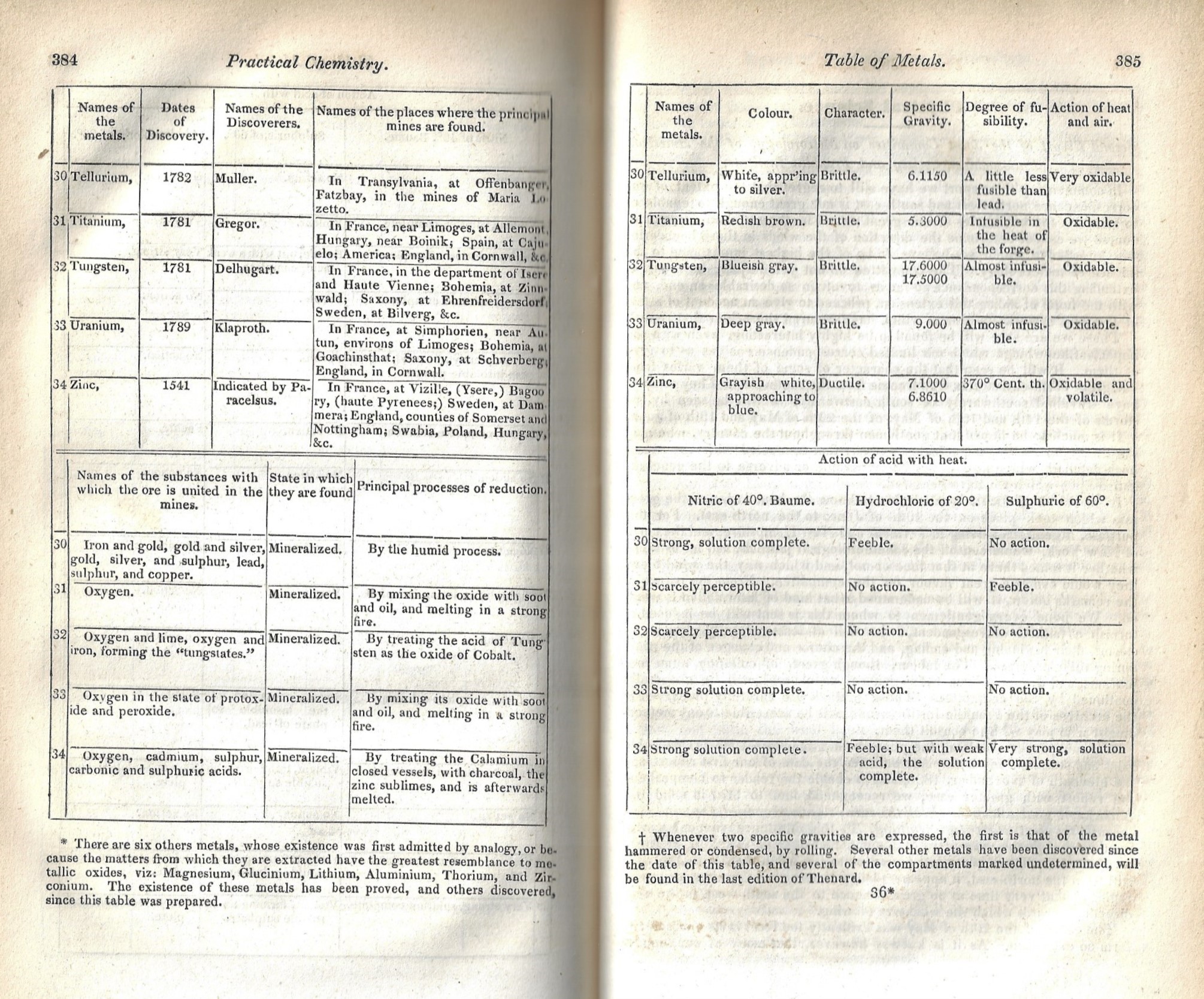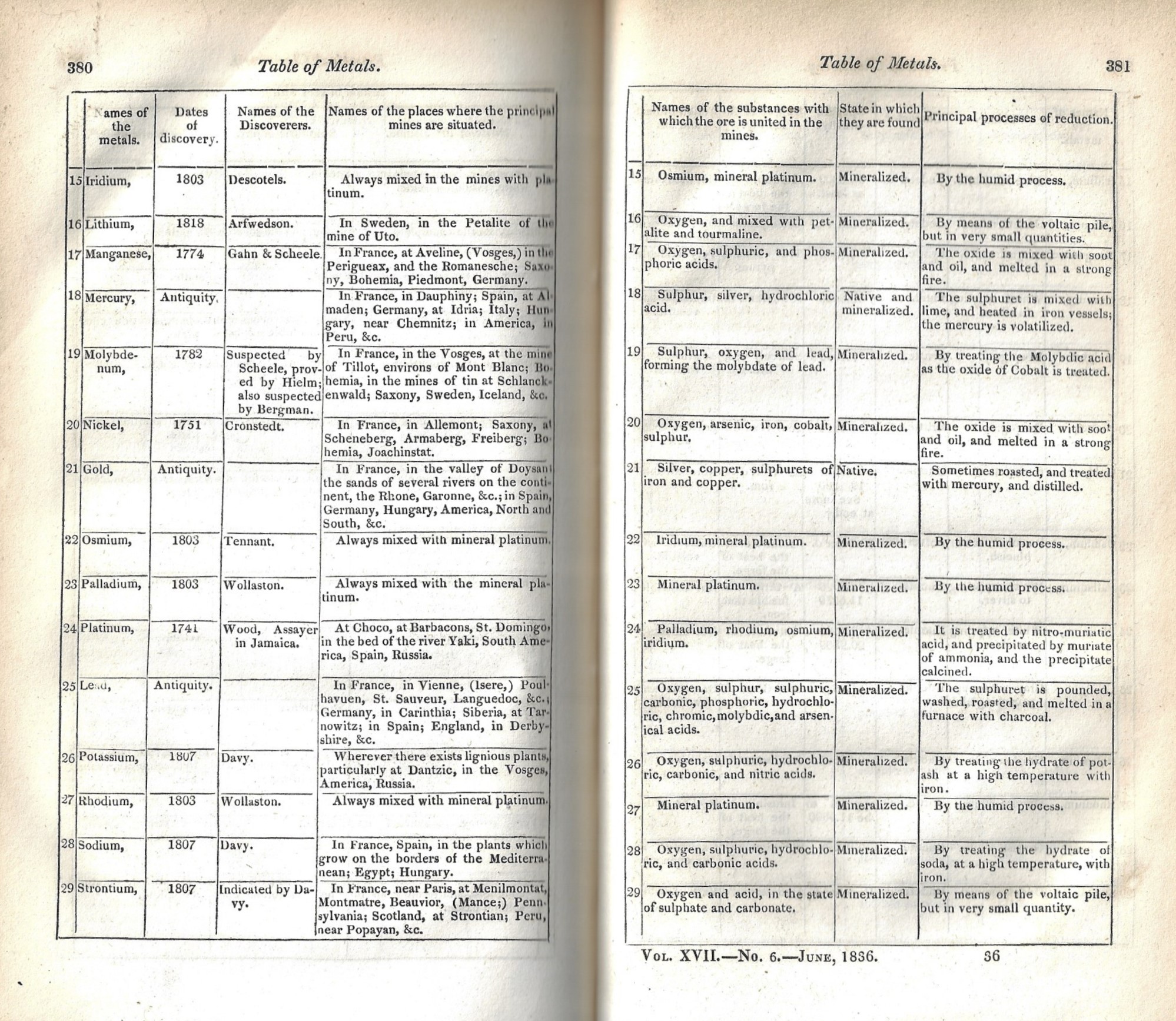 Franklin Peale, “Table of Properties &c., of the Metals, taken from a table by M. Chaudet of the Paris Mint”, pp 375-385. This is basically a tabular report on 34 metals, listed alphabetically, and including dates of discovery and the names of discoverers, plus the names and locations of the principle mines, plus color, character, stability, specific gravity, state in which the metals are found, and several other properties. Journal of the Franklin Institute, Philadelphia, 1836; volume 17 (new series) and volume 21 overall, with text illustrations and four plates, 440 pp