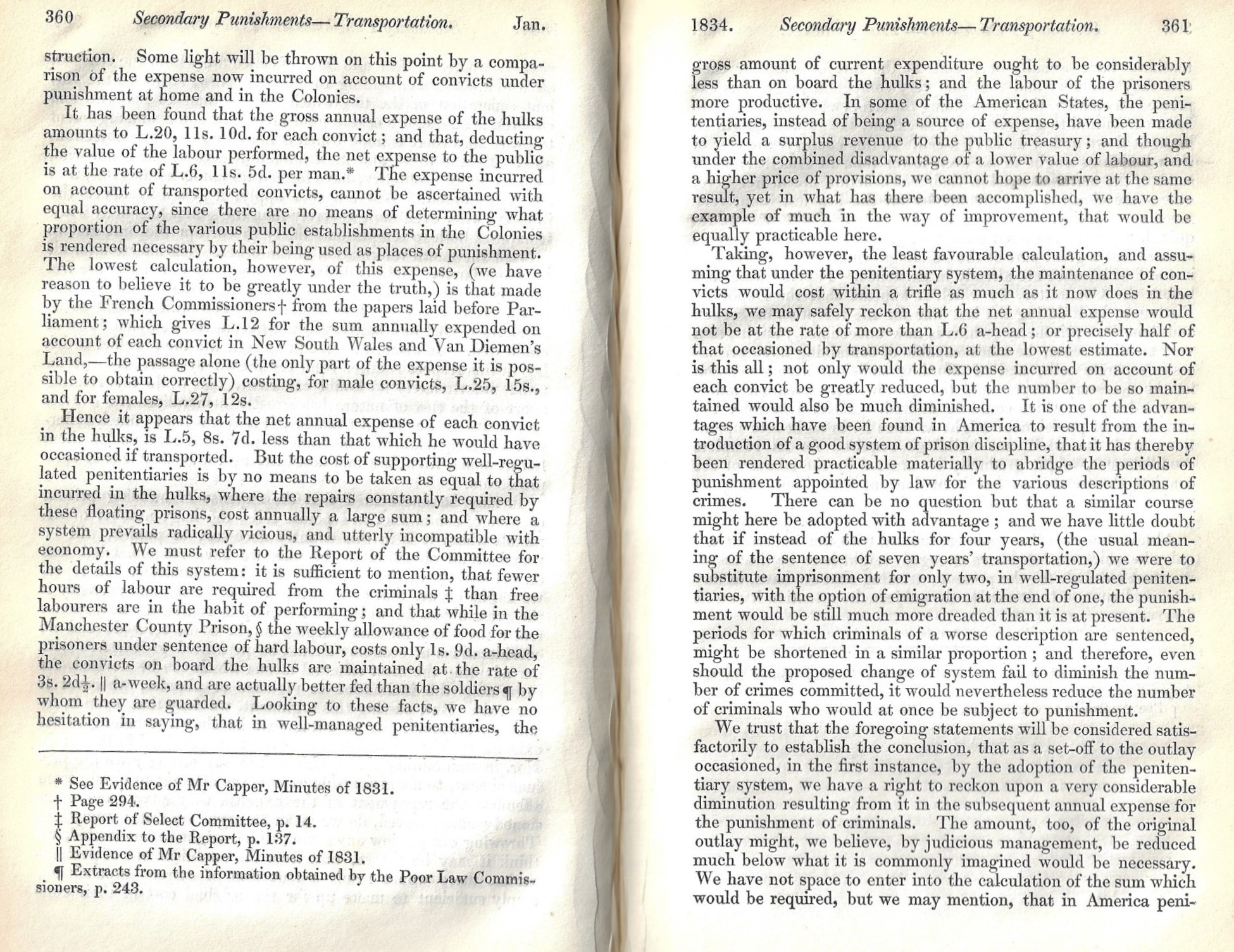 What the writer seems to be saying here is that if there was greater discipline in British prisons as in America there would be a net loss of convict time served and thus a savings per crime. Rather than pay for four years of some sort of punishment and discipline that if done correctly (more aggressively) the effort could be accomplished in only two, “the punishment would be still much more dreaded than it is at present”. “It has been found that the gross annual expense of the hulks2 amounts to L.2o, less work done by the convict to a net cost of “L.6, 11s. 5d. per man.”