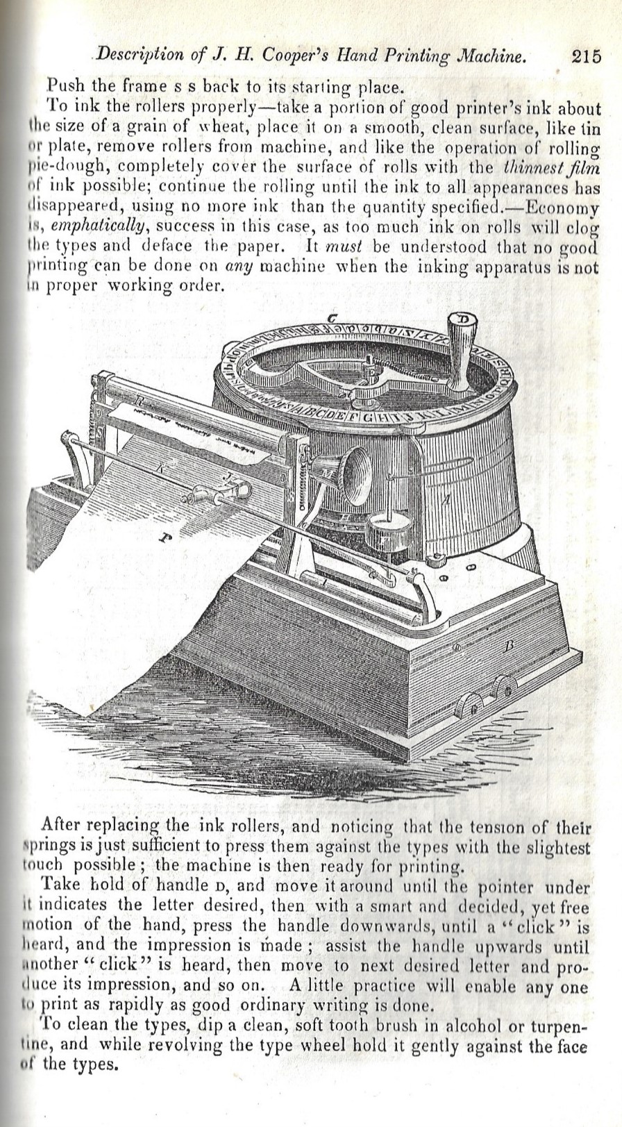 It is difficult to see some of the annotations, even in the original, and even with a magnifying glass, but for that first indicator "H" you can find it just southward of the bell-like object ("M", which turns out to be a handle for the paper roller), and "E" was another difficult one to find, and that one turns out to be the pivot in the center of the type circular. In any event, the thing operates much like a typewriter, the lever "D" moved to the position of the letter needed, then pressed down, moving the type into place against the ink and the paper, which is loaded in rollers much like a modern typewriter.