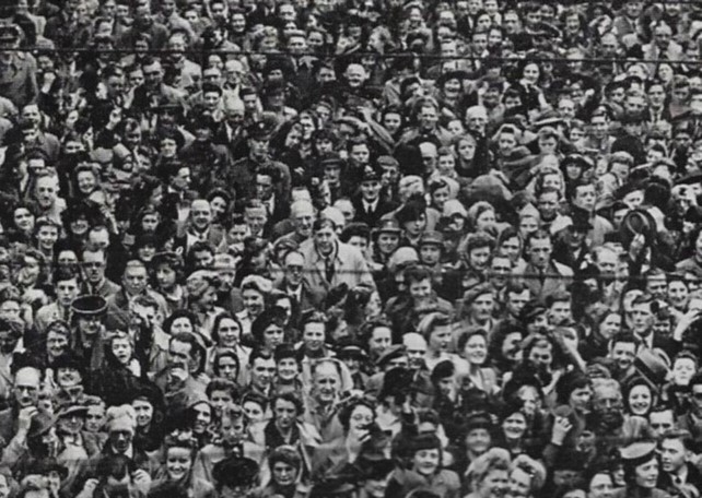 I've written a number of posts on this blog on dense crowd imagery in photographs--parades, armies, union marches, protests, celebrations, work environments, and so on,not the least of which are the famous Weegee million-person-Coney-Island beach scenes. (All of these are findable via the Google search box at right.) Today's installment is the back cover of a small pamphlet called Your City, a Handbook for the Citizens of Liverpool, which is a short guide to the nuts-and-bolts of living there. The remarkable thing about the dense crowd photo is that so many of the people are smiling, which to my experience is not a common thing. Since this pamphlet was published in October 1945 my guess is that the crowd formed in celebration for the end of WWII in Europe or Japan, resulting in this photograph of 2,000 smiles.