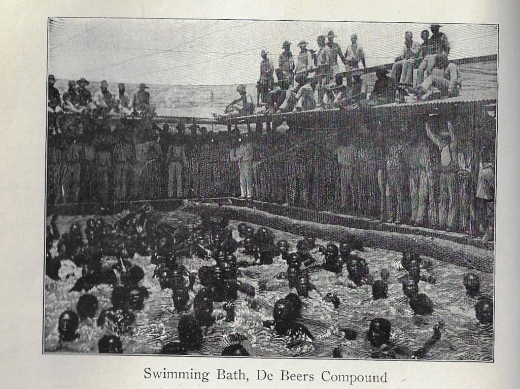 - “Fully four acres are enclosed by the walls of the De Beers compound, giving ample space for the housing of its 3,000 inmates, with an open central ground for exercise and sports. The fences are of corrugated iron, rising ten feet above the ground, and there is an open space of ten feet between the fence and the buildings. At the northern end of the compound there is an entrance gate. Iron cabins fringe the inner sides of the enclosure, divided into rooms 25 feet by 30 feet, which are lighted by electricity. In each room 20 to 25 natives are lodged. The beds supplied are ordinary wooden bunks, and the bed clothing is usually composed of blankets which the natives bring with them or buy at the stores in the com pound, where there is a supply of articles to meet the simple needs of the natives...”