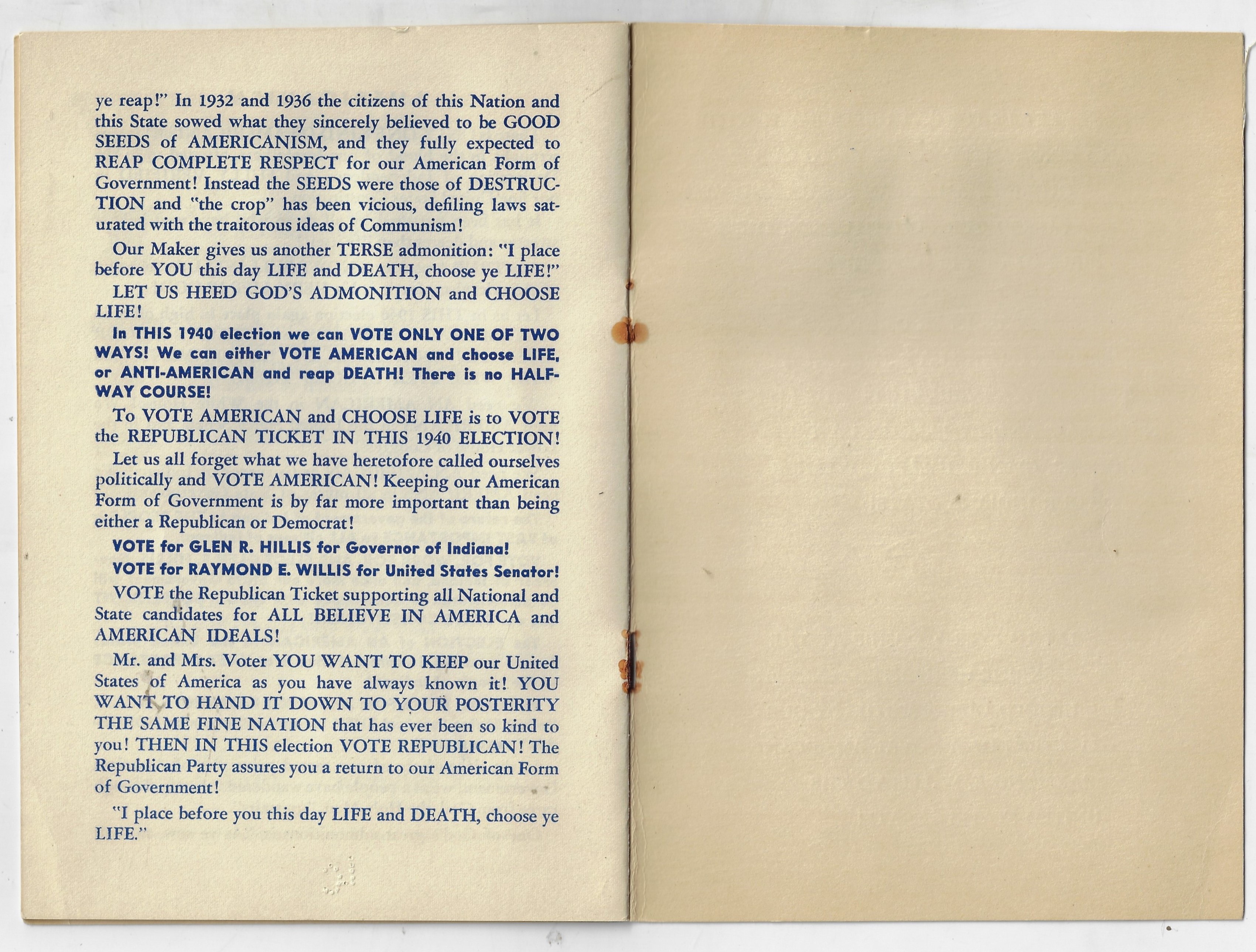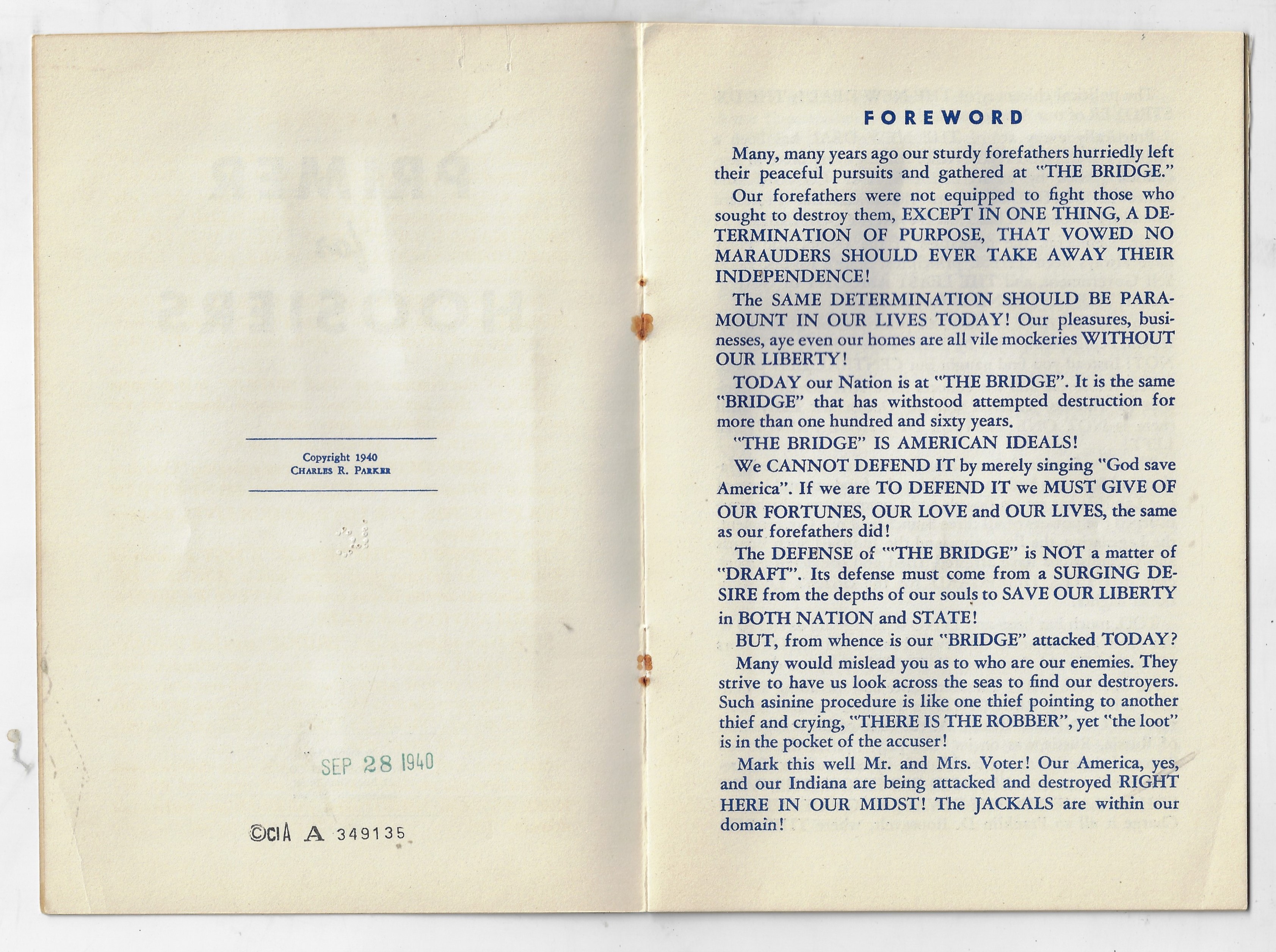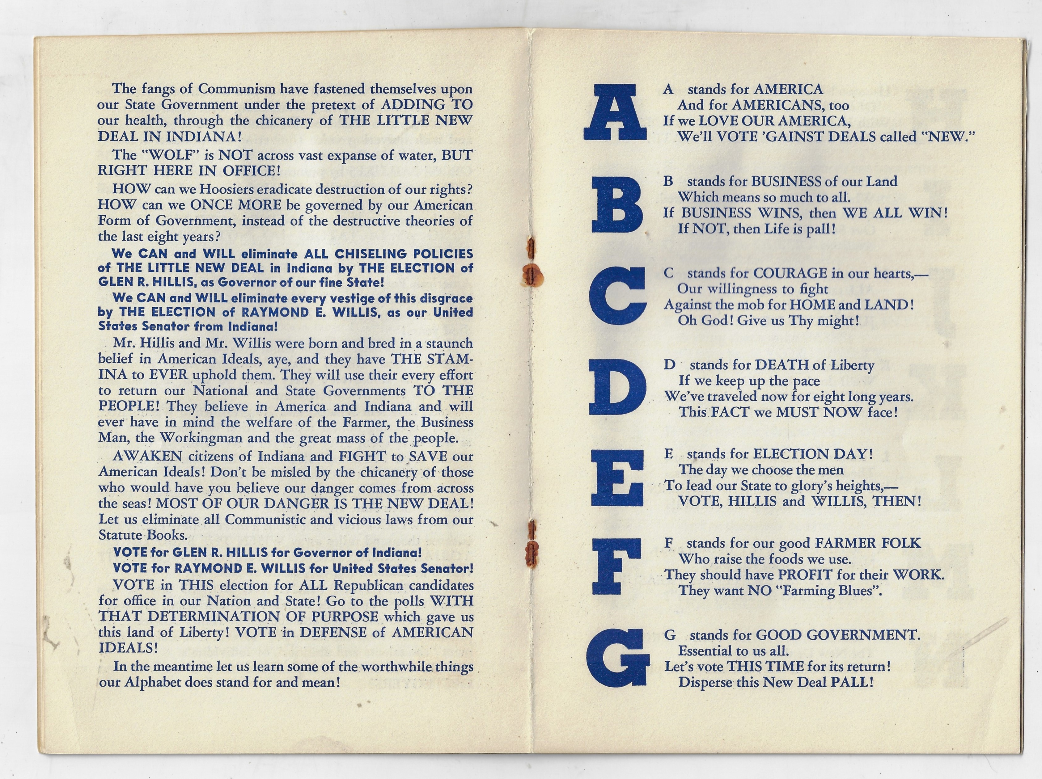 I'm not often able to make a post in the "Alphabets" category of this blog, though I can today after finding this untempered, bolded, all- and random-capped, exclaimed attack on Franklin Roosevelt and the New Deal. Charles R. Parker's Primer for Hoosiers, ABC which was printed for Parker-Daniels Co. of Indianapolis in 1940, is a top-percentile viciously anti-Roosevelt work as there ever was. Parker's pamphlet was a polemic proclaiming patriot punditry (sorry) for a couple of Indiana politicians while taking enormous and unsubstantiated baby bites into the fringes of Roosevelt (powering into his third term) and the New Deal (which was pretty much folded in at this point). This pamphlet is only ten quick pages, but in it we find descriptions of the president as a robber, dictator (many times), destroyer, and so on who uses Hitler as a shield and whose policies of chicanery have devastated, menaced, destroyed, and raped the principles and Constitution of the U.S. Overall the writing and style is not far from what we have in the White House, right now.