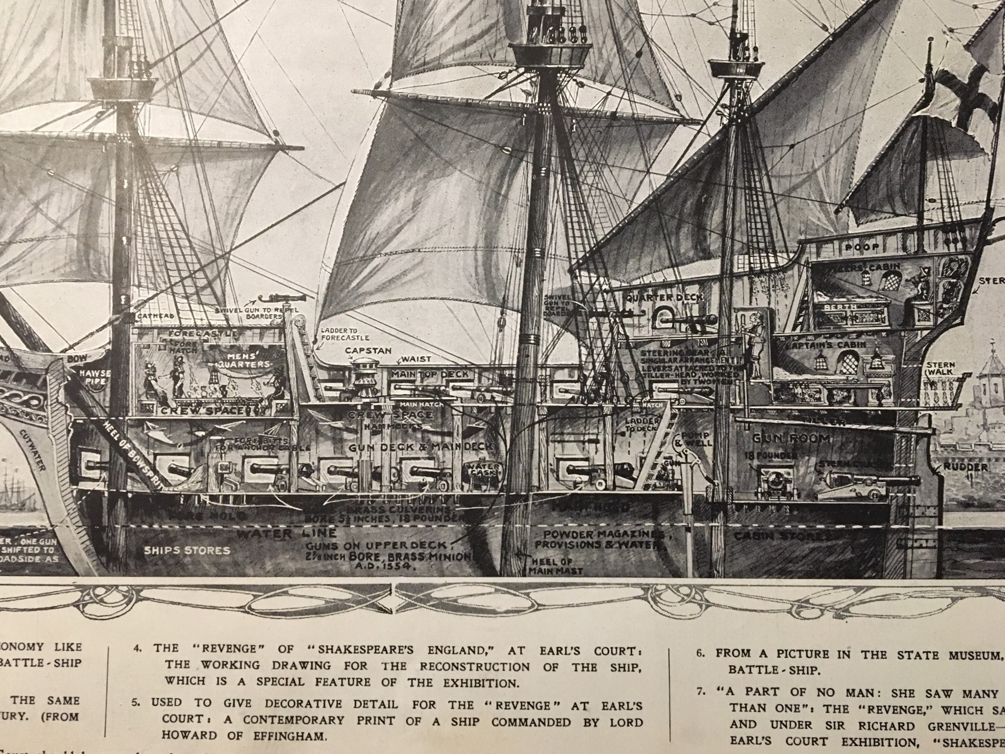 “On July 20 the day on which the London Devonians celebrated the 324th anniversary the defeat of the Spanish Armada the King and Queen paid a visit to the England Exhibition at Earl's Court. Amongst other things they inspected the model of the Revenge famous not only as the one of the one and the fifty three whose great fight Tennyson tells so dramatically in The Revenge, A Ballad of the Fleet but as the flag ship of Drake beyond doubt the greatest man who ever set foot aboard her. The ship as reconstructed at Earl's Court is 104 feet long from stem to stern with a height of 127 feet from water line to top of mainmast and a breadth of beam of 28 feet...” Illustrated London News, 10 August 1912.