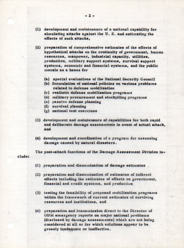 Continuing on page two, the Damage Assessment Division would create damage estimates, "disseminate ...estimates of indirect effects including effects...on government, financial and credit systems, and production..." which of course is, well, everything. Except overall assessments of total numbers of people killed, which isn't a necessary statistic for most of the stuff we're talking about here.