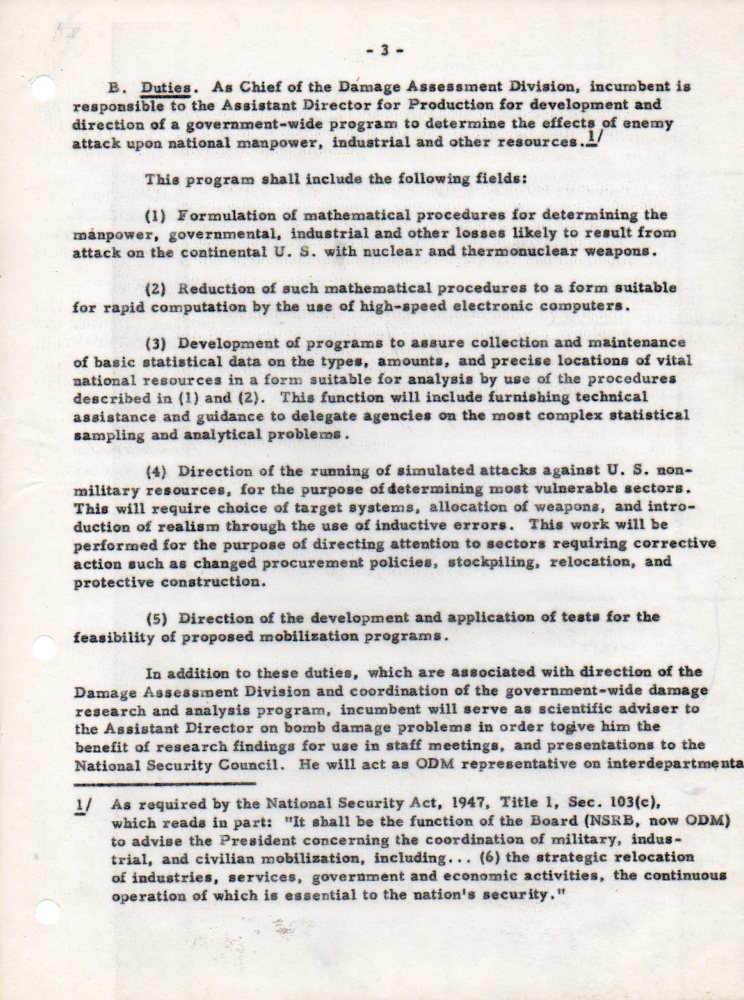 The position description clearly makes distinctions between pre- and post-attack responsibilities of the Chief of the Damage Assessment Division: under "Nature of Purpose of Work", part 1, section A (1) it reads "a pre-attack capability for translating likely patterns of attacks into losses of manpower, industrial capacity, and weapon systems output'. In Section A (2) we see"a post-attack capability for assessing actual losses, for alternating alternate levels of output consistent with surviving resources and for testing feasibility of proposed new mobilization programs". Or in other words, sifting the rubble to see who and what was left and to see where they could be actually plugged into whatever scenarios had already been planned, and alter as necessary. And also on page two, part (3) "development and maintenance of capabilities for both rapid and deliberate damage assessments in event of actual attack..."