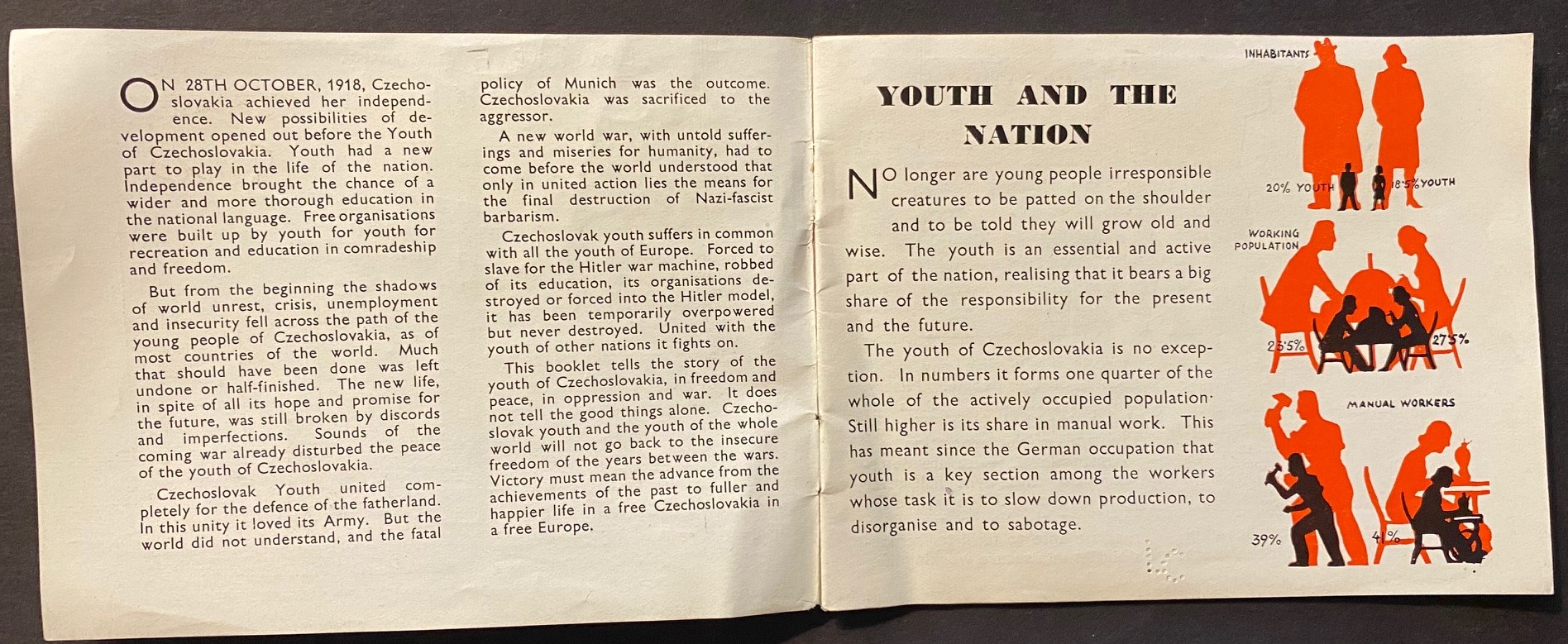 Youth of Czechoslovakia1 was a Czech-in-exile response to the situation in the country as it stood in 1943. The situation of course was critical, and the compiler of the work, F.L. Lowidt, chronicles the state of the affairs from the end of the First World War to the occupation sometime late in 1943. About half of the work concentrates on the war period following "the fatal policy of Munich" and the "sacrifice" of Czechoslovakia to impossibly placate Hitler. It is a very interesting document, and as there are only a half-dozen or so located by WorldCat in libraries worldwide, I'm reproducing it here. Of special note are the four pages or so dealing with children and the youth being used for "forced labor in Hitler's war machine", the "martyrdom of youth", and the resistance movement.