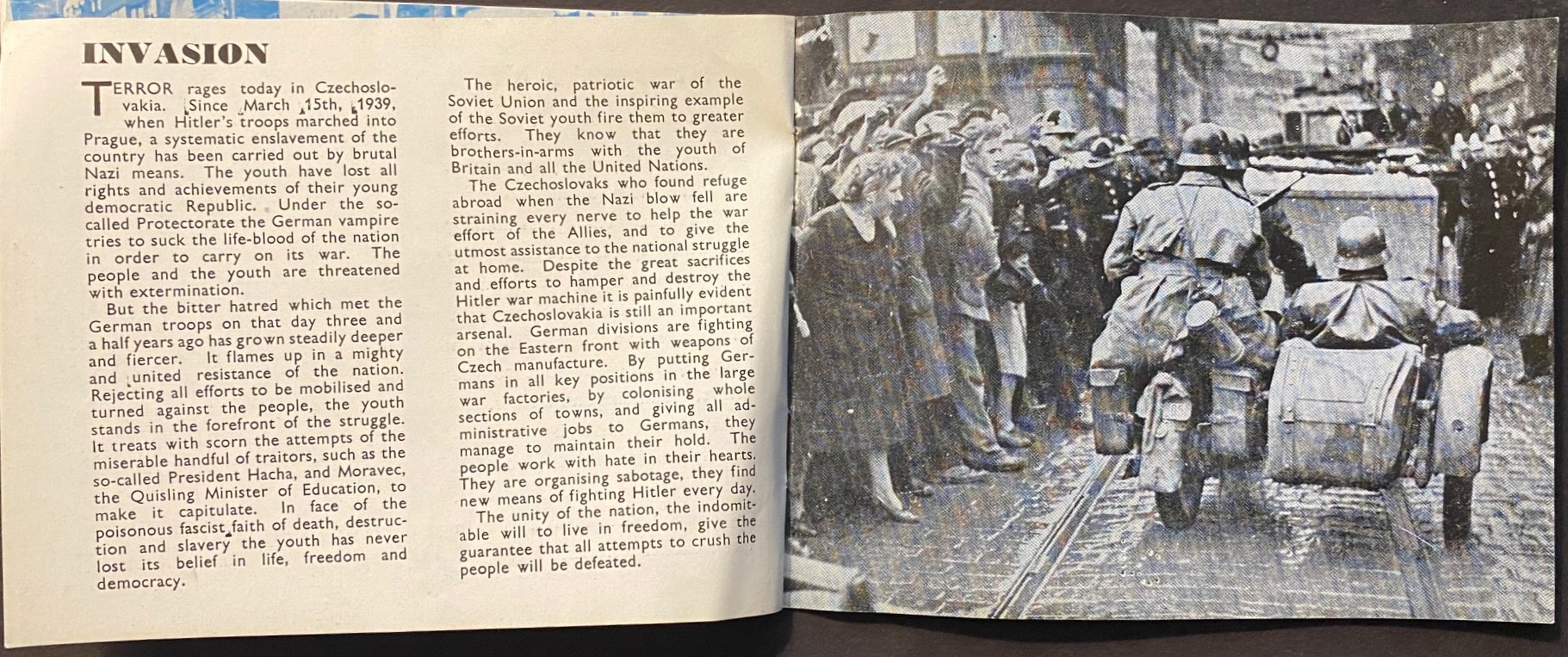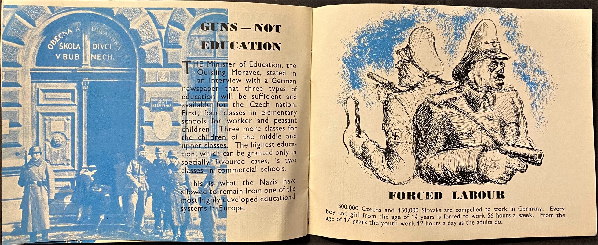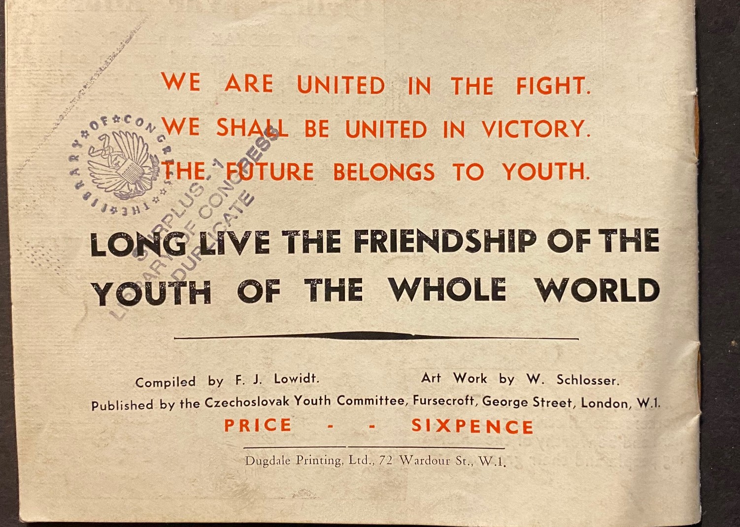 1. LOWIDT, F.J. (compiler); artwork by W. Slosser. Youth of Czechoslovakia. Published by the Czechoslovak Youth Committee, London (and printed by Dugdale Printing, Ltd.).[1943] No date stated but WorldCat (which locates only six copies) believes it to be 1943. My copy--a Library of Congress duplicate--has a cataloguer's pencil notation for being received on 6 March 1943.