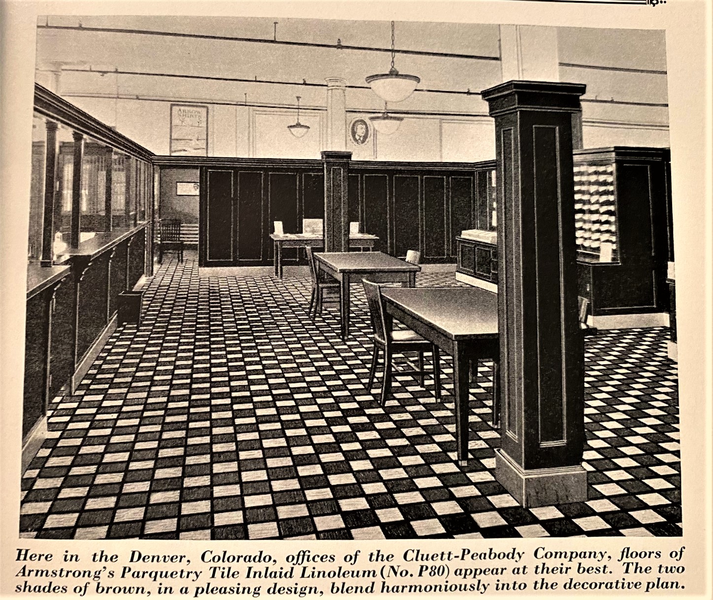 This is a pretty unassuming pamphlet, judging from outward appearances (see below)1. It is an advertising promotional published in 1924 for Armstrong Cork Company of Lancaster (PA) pushing their extensive selection of linoleum flooring. (Linoleum, by the way, was created in the 1850s and was a constant source for durable and inexpensive floor covering for about 100 years...the first linoleum factory established in the U.S. was on Staten Island, NYC, with the company settled into a town they called Linoleumville, which was later renamed "Travis". Anyway, I digress...) I'm drawing attention to the publication because of the illustrations, which are no doubt standard for the time and made to be complimentary, though they look a lot different from their intentions looking at them today--at least to me. There's a LOT of distortion in the perspective, some of it from the camera angle and some of it, well, from the highly repetitious designs in the flooring, as you can see here: