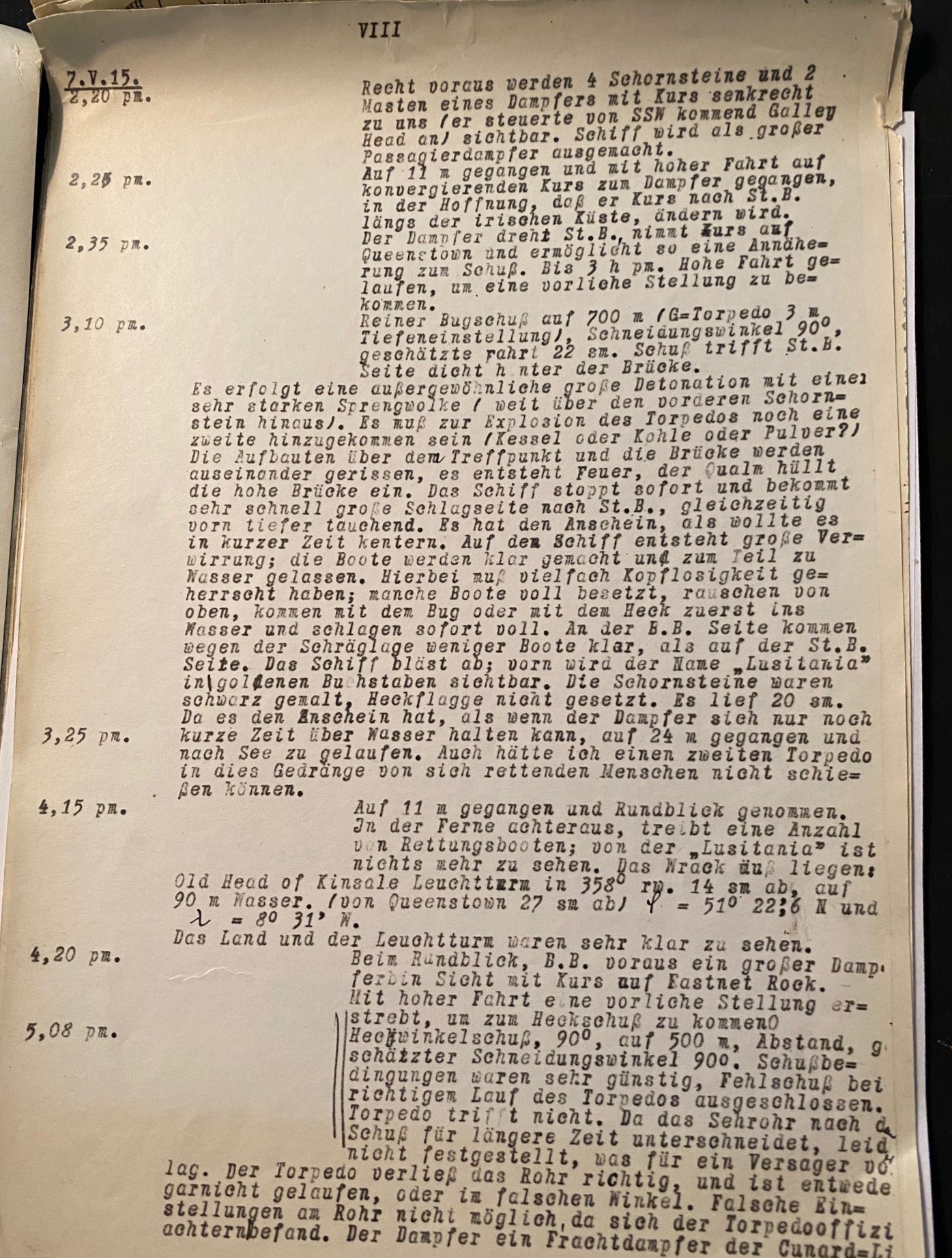 A summary of the attack day—7 May—details that at 2:20p.m. Schwieger reports on tracking a possible target and then sees "four funnels" ("Schornsteine"), identifying the target as a large passenger steamer. Schwieger positions his boat and fires one torpedo "in the side close behind the bridge" followed by an "extraordinarily" large detonation, stopping the ship immediately and causing a severe listing. Schwieger then states that he sees "Lusitania" written in gold on the side of the ship.