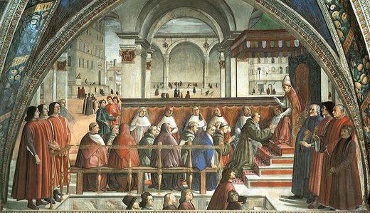 What concerns me right now though is his fresco in the Sasseti Chapel of the Santa Trinita of Florence, painted about 1485, “The Confirmation of the Rule of St. Francis”2. Part of a series of works on St. Francis, this fresco represents the visit of the saint to Rome, though Ghirlandaio moved the “Rome” part to Florence (as the background is filled with famous Florentine buildings).3
