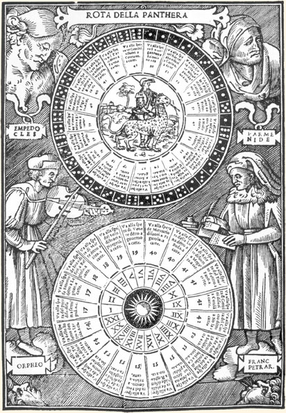 “The pages representing wheels are bordered by eight alternating frames containing a series of musicians, astronomers, artists, writers, popes, rulers, and other distinguished figures of the past and present, labeled differently at each appearance. Among the artists named are Andrea Mantegna, Raphael of Urbino, and Baldassare Peruzzi, the designer of the frontispiece. On the page shown here, at right, the astronomer and artist are identified respectively as the book's author, Sigismondo Fanti, and the painter Dosso Dossi (died 1542), who was also from Ferrara and who has been plausibly credited with the design of the figural borders.”