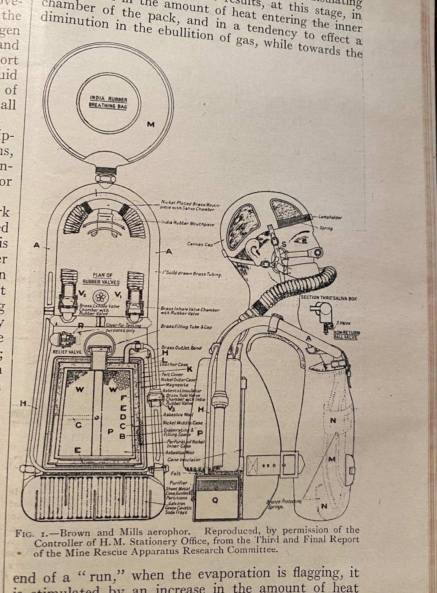 Brown and Mills evidently worked and improved an earlier idea and design by Col. Cuthbert Blackett (1910), which this citation from Wikipedia: "The Blackett's Aerophor is a nitrox semi-closed-circuit rebreather with liquid gas storage made in England from 1910 onwards for use in mine rescue and other industrial uses. It was used until the 1950s. "Aerophor" is from Greek αεροφορος = "air-carrier". Its breathing bag was on the chest, of rubber, in a strong leather case. The other parts were in a backpack. It had two corrugated breathing tubes coming out of the backpack. Its duration on a fill was 2 hours. "