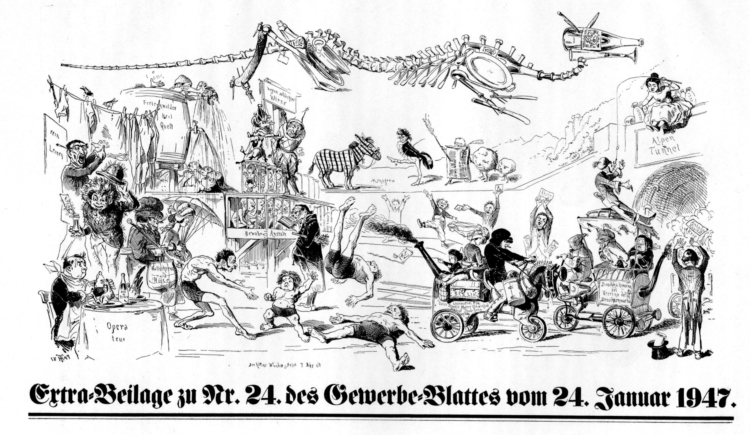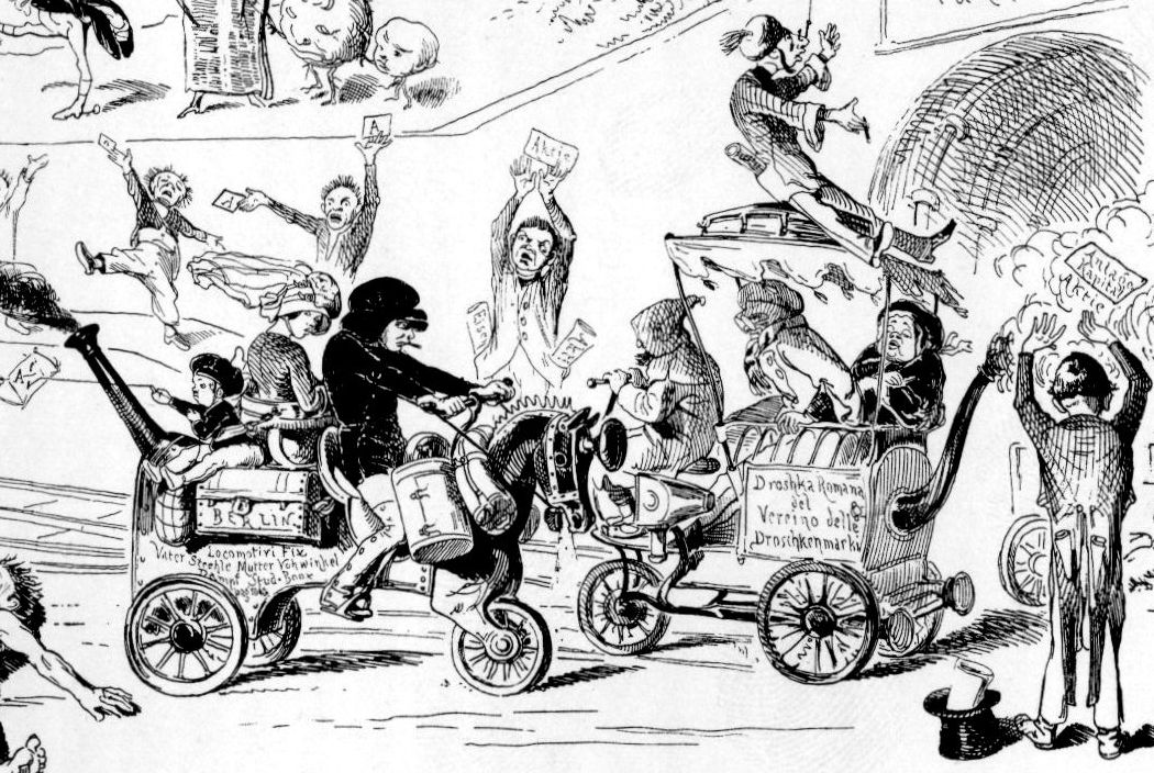 We see small and large individual steam-powered four-wheeled vehicles, as well as plenty of balloons (in the spirit of aviation, at this point in its fourth decade and entering a great heyday) passing each other in every which way, off on adventures, or work, or in a race (as with the "out of Sight Club"). There are also numerous people flapping around in the sky ("winging it so early") with their (something)-powered wings, some of whom are ironically hunting birds.