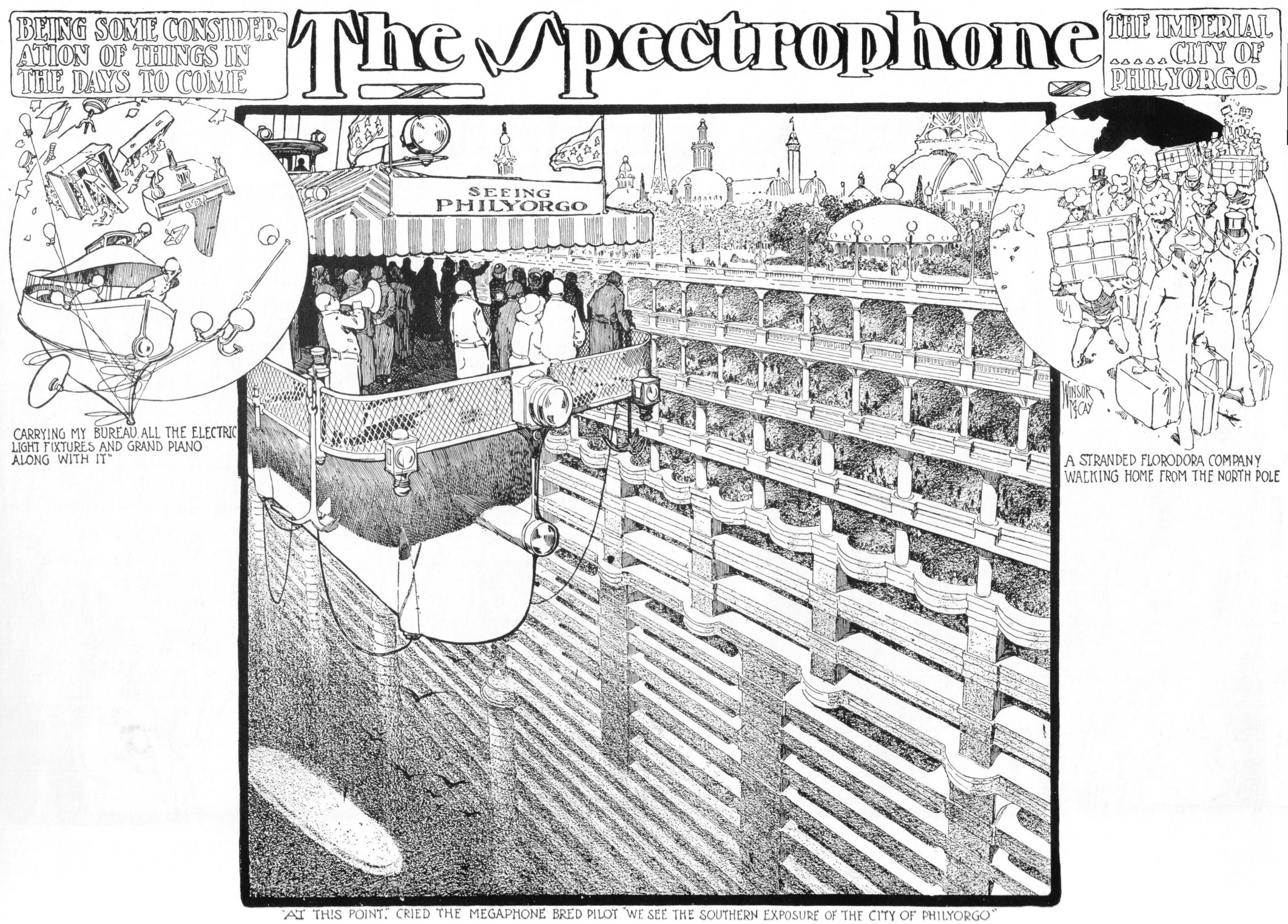 How do we sort thousands of people writing about hundreds of thousands of future sightings in human development? Flying cars and people and cities and retrievable/liveable subconscious bits and dream, atomic blast guns, two-way wrist tv/radios, perfect places of nothing but intellect and floating intelligence, horseless cities, Soylent Green, personal computers small enough to fit into the trunk of your car, Edison's anti-grav underwear, buffalo herding from nuclear-powered sports cars, Maginot Line-sized mobile tank-ships, rockets to the Moon, rockets to the Sun, and rockets to tomorrow and to yesterday. We have futures where Manhattan is completely covered by thirty-story skyscrapers by the social warrior Thomas Nast; where George Holmes kills off cities with airplane-filled suburbs in 1912; where electric titan tank monsters with canons instead of cigarettes crushed hopeless opponents in 1918; where atomic-powered dirigible airports free up land in 1946; where a floating NYC is moored above the hole-in-the-ground where it once stood. Where spacecraft of mega-sharp ultra-fins await their cigarette-smoking pilots in 1953 and out-Eiffeled mile-high vertical airport towers, and where an identical duplicate Earth floats serenely in place above a bird's-eye view of Manhattan.
