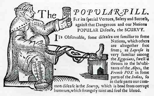 Dr. Nendick was up to with the pill, but I do know that is was obtainable from grocers, bakers, cutlers, gunsmiths and barbers all over England at three shillings for forty tiny dots of possible joy. Its imaginary Galenical powers were supposed to bear against the tedium and insolence of all manners of scurvies and popular complaints--much like its contemporary dot/pill rivals like Pilulae Anti-Scurbuticae (sold at the Carv'd Posts in Stonecutter Street between Shoe Lane and Fleet Ditch (!)).