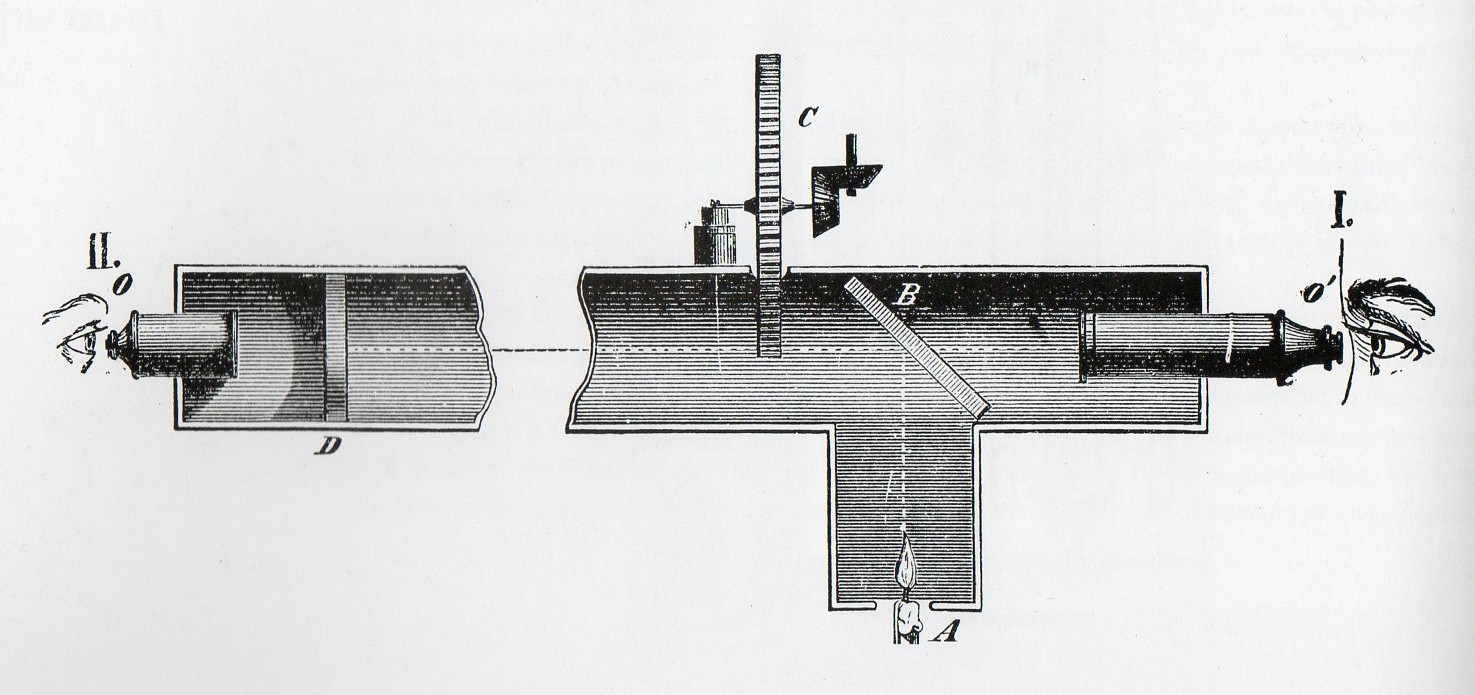 I meant this title to this post quite literally—among the earliest mostly-accurate estimation for the speed of light (“c”) was made by Fizeau in 1849, and he not-literally made an image of what the speed of light “looked like”, the last dot in a crack that let the light in. It followed several hundred years of thinking on the speed of light including experiments employing lanterns (Galileo), the Moons of Jupiter (Ole Roemer), rain and starlight (James Bradley), and which in turn followed thought experiments by Empedocles, Aristotle and Descartes, who reckoned the speed of light to be instantaneous. The Parisian physicist Armand Hippolyte Louis Fizeau (September 23, 1819 – September 18, 1896) acted on a beautiful idea and constructed an elegant apparatus (again using lanterns) to make the first modern estimate of c. And, basically, as soon as he was finished and published the results in the Comptes Rendus in 1849, Leon Foucault—with whom Fizeau worked on many occasions—improved the apparatus and made an even closer approximation.