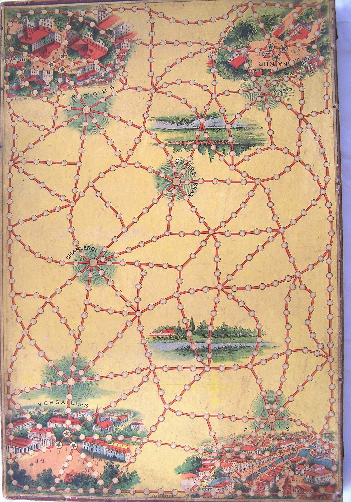 There are many board games in the history of boards games that utilize dots similar to this game, but this one seems mightily different given the dots' odd arrangement, and seeming disambiguation, and the means to the ends of the "race". It is an unusual arrangement, or so it seems to me, given the amount of blank space and the connected dis-connectedness of the routes. The game looks to me more of a capturing of empty space than a competition of getting from Paris to Bruges in the shortest amount of time...though not in a space-capturing sense of Go--just in defining the empty space.