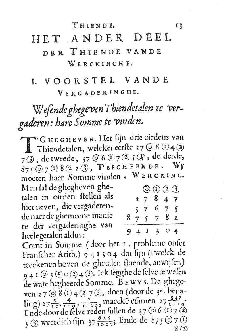 Simon Stevin (1548-1620) introduced the idea of decimal numbers in his 36-page De Thiende ('The Art of Tenths"1) in 1585, an idea that replaced much more cumbersome earlier methods of representation. So, the number 3.14159 would be written in the Stevein notation as (where in this case numbers enclosed by brackets, i.e. "[9]" would have been represented in print as a 9 within a circle) 3[0]1[1]4[2]1[3]5[4]9[5]. It is also seen here: