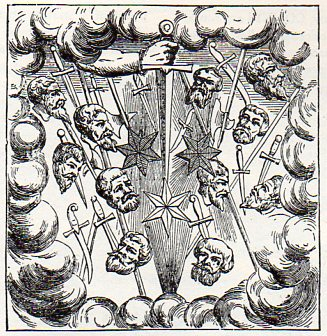 The fear aspect of comets--the Comet of 1528--was depicted in Ambrose Pares Livres de Chirurgie (1597), and shows what part of the concern was (the coming demise of nations, the death of rules) with the appearance of decapitated heads and a large sword and raining daggers: