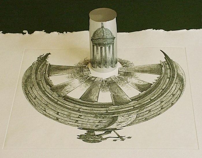 This example is much more recognizable in widely-circulated images of the modern work of people like Kurt Wenner, who have continued in the tradition of Leonardo's researches in the difficulties of wide angle distortion: