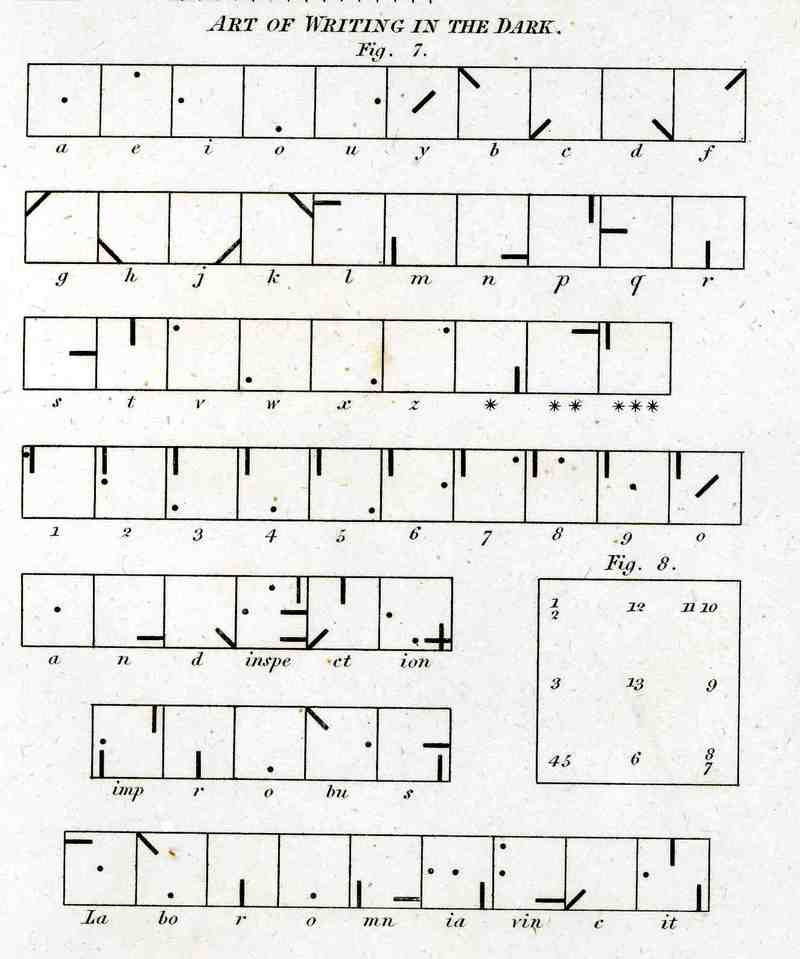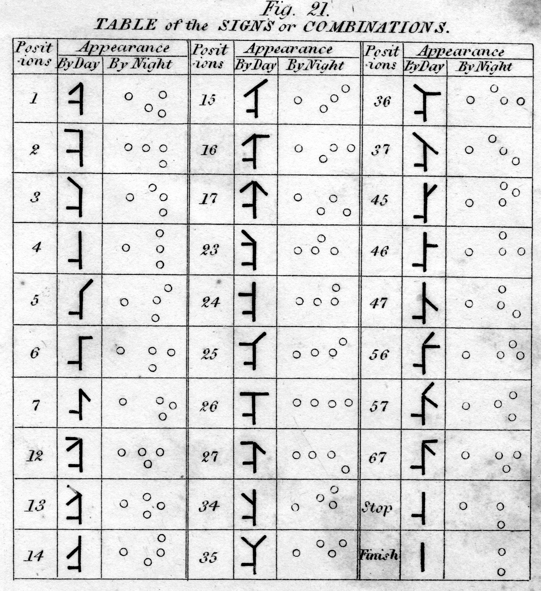 Signaling at sea at night was somewhat different at this time and didn't include anything remotely close to the alphabet. So the rather complex system that we see here (above) is extremely uncommon--it seems also very unwieldy to put into effect. Unfortunately I don't have the text volume that would explain then entire system and implementation, so I'm going to guess that there was a large, powerful light source that was covered by a tight, black, covering tablet that would eliminate nearly all light leakage. The symbols for each letter of the alphabet (and numerals) would be cut out from another tablet that would fit over the face of the light source, placed between the blank and the light. To transmit a letter the user would then simply remove the blank covering tablet to reveal the light broadcast by the hole or slit in the tablet underneath. The blank would then be placed back, a new tablet for a new letter placed underneath, and the process would begin again: blank (dark); letter (light); blank (dark); letter (light), and so on to the end of the message. I guess the distance at which these symbols could be seen would be dependent on light source, atmospheric conditions, ad so on. The way that the letters are made into symbols seems to me very intelligent, so that you distinguish the differences from an appreciable distance. I like it--its an elegant idea. (Well, maybe it didn't work in this manner, but it seems to make sense to me.)
