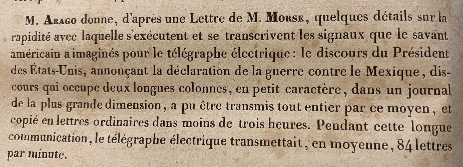 Here's probably an obscure bit on the coming of a very large change in journalism and the dispersion of information: a short announcement of the use of the electric telegraph in the rapid reporting of war news. The notice appeared in the Compte Rendu des Seances de l'Academie des Sciences 15 June 1846 (volume 22 no. 24, p 1004), and it is communicated to the Academie by Francois Arago, and runs for only about 100 words. Arago mentions how quick the operation of the electric telegraph was (citing our Mr. Morse), basically drawing attention to this new mode of data dispersal. He uses the example of the speech of the U.S. President (James Polk) on the new Mexican-American War, which was begun 25 April 1846, just weeks earlier than this report was published. Arago doesn't mention the very dramatic spread of telegraphy lines and far-reaching nodes that blossomed in the U.S. Earlier in 1846...maybe he didn't know of them, yet. What he does talk about is the astonishing bit of the Polk's war address being disseminated so quickly—evidently the whole thing was transcribed and telegraphed in three hours. That seems today to be quite glacial, but this was done at a time when news was coming by packet steamer, Pony Express, and the U.S. Post by horse and wagon. To be suddenly able to disseminate news from Washington DC to Richmond and Albany and NYC and Boston all in a matter of hours from Morse to text was really quite astonishing.