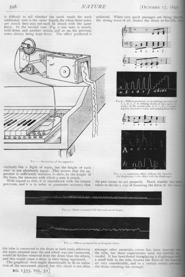 “The apparatus...is quite simple in construction and consists chiefly of an india rubber tube placed under the key board united at its two extremities by a registering drum also of india rubber When the notes of the piano are played the pressure on the tube causes a wave of air to be sent through it into the drum upon which is attached a pen that in the ordinary way is made to record its movement on a moving roll of paper The wave makes the drum vibrate which in its turn jerks the pen thus causing irregular marks to be left on the paper The board on which the tube rests is regulated by means of w edges adjusted by a screw the board being either lowered or raised When raised it almost reaches the notes of the piano and in this case the registering action takes place but if it is lowered the whole apparatus is disconnected from the key board...”