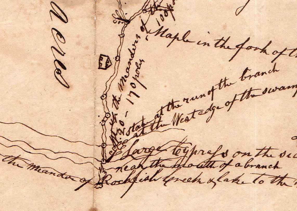 These stories came to mind just this afternoon again while cataloging an 1842 manuscript map made by Britton Hood, Jr., who was the son of a surveyor Hood Sr. who worked through the late 18th c and into the middle 19th. The family was in Wayne County, and it looks as though the son stayed their, at least according to a hint or two on this map. Although the location is not identified the major feature is, and the "Cabin Branch" of the map may be the "Cabin Branch" creek that is south-central Wayne County, south of Goldsboro.