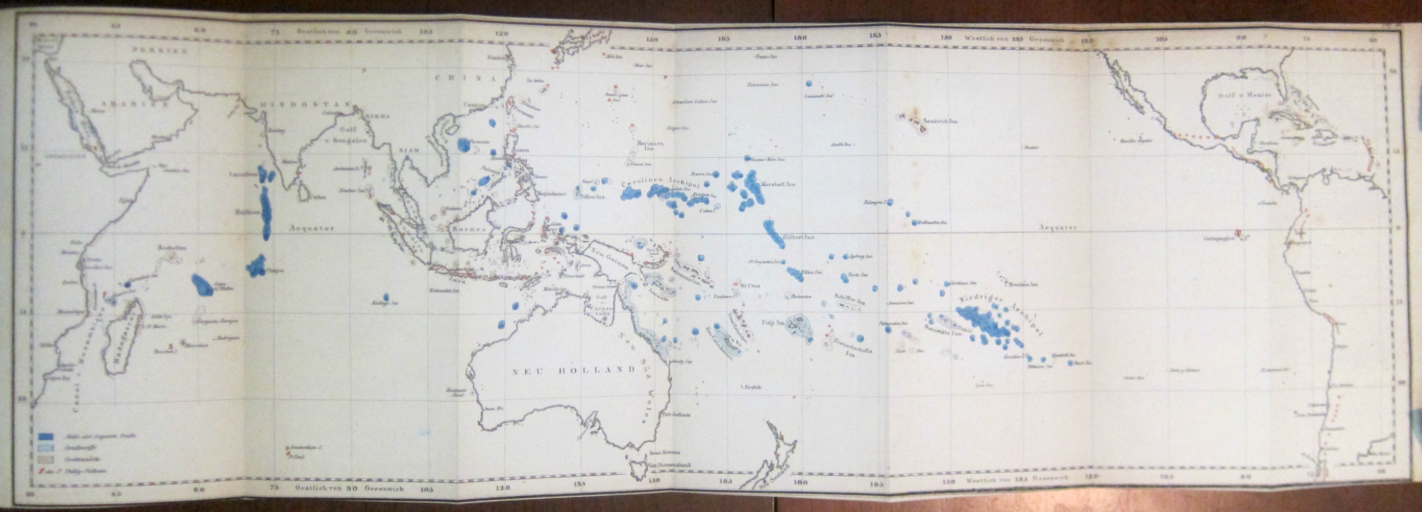 I was surprised to find this long and early (1845) contribution1 on Darwin and his ambitious work on coral reefs in the generally physical-sciences-heavy Annalen der Physik2. The surprise was ever more so because of the illustration for the article--a German version of the coral islands/reefs map that appears as the frontispiece to Darwin's The Structure and Distribution of Coral Reefs3... that appeared three years earlier in 1842. (Darwin's Journal of Researches..., today more commonly known as the Voyage of the Beagle, which was the third volume of Narrative of the Surveying Voyage of His Majesty's Ships Adventure and Beagle...... was published in 1839, and his first publication of any kind appeared ten years earlier in 1829; the first German translation of the Narrative appeared in 1845 as Naturwissenschaftliche Reise. As John van Wyhe--the founder and curator of the fantastic resource Darwin Online--points out the German translations were significant because "It was in German...that Darwin influenced the founder of genetics Gregor Mendel, and the pioneering evolutionists August Weismann and Ernst Haeckel"4.)