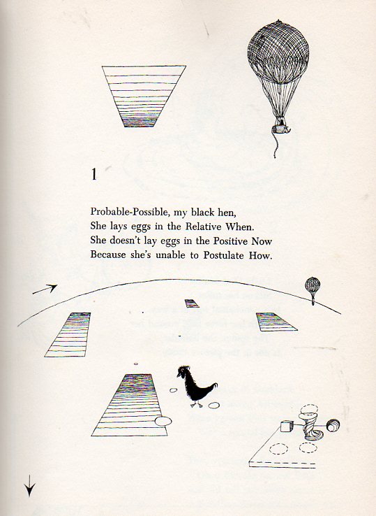 The physics-esque approach to the old idea rests in the verses of Frederick Winsor in his The Space Child's Mother Goose, printed by Simon and Schuster in 1958, the stories helped along by some fine and tech-intricate drawings by Marian Parry. The poems are occasionally delightful as works in themselves; but when you grade the work on a curve of science poems/funny science, it gets an even higher grade. Let's face it--there weren't that many works in this genre in the 1950's/'60's, so it gets a little help just for being a friend to the lonesome in the pop-science-poem arena. (The text for the volume can be found here; and if you wanted to own it you may purchase it from our blog bookstore, here.)