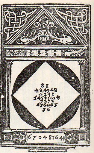 But I guess I cannot leave the subject of "pretty" magic squares without referencing a "beautiful" one, and this being one of the earliest inclusions of a magic square in Western printmaking, and surely one of the most beautifully-encumbered one in general, from Albrecht Durer's mega-popular masterwork, Melancholia (printed 1514). The magic square had been around for at least 2,000 years at this point, starting up evidently in China between 650-1000 BCE before making its way west through the Arab lands and then through India, and finally into Europe around the 13/14th century, and then into art prints with Durer in 1514.