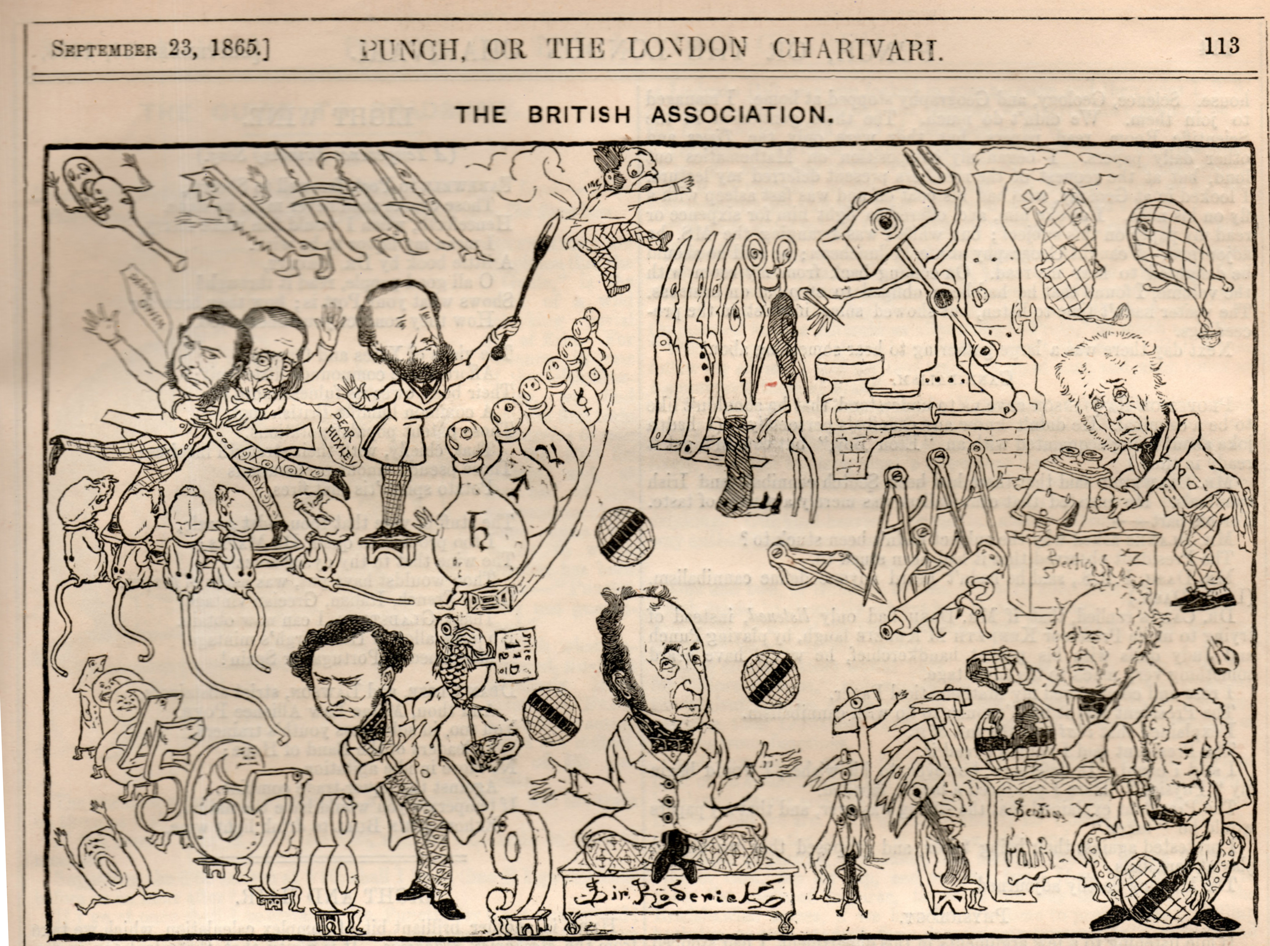 This fine cartoon appeared in the 23 September 1865 issue (page 114) of the London Punch magazine, poking a little fun at the recent meeting of the British Association for the Advancement of Science, which had just finished its 35th meeting in Birmingham. Its attendees and contributors read like a "who's who" of the heights of mid-19th century British sciences (across fields of geology, physics, physiology, chemistry, mathematics, statistics (and economics)): attending and contributing were JC Adams, Airy, Hooker, Thomas Graham, Wheatstone, Nasmyth, Fairbairn, Murchison, Lyell, Huxley, Thomson, Maxwell, Tyndall and of course numerous others (also including foreign members).