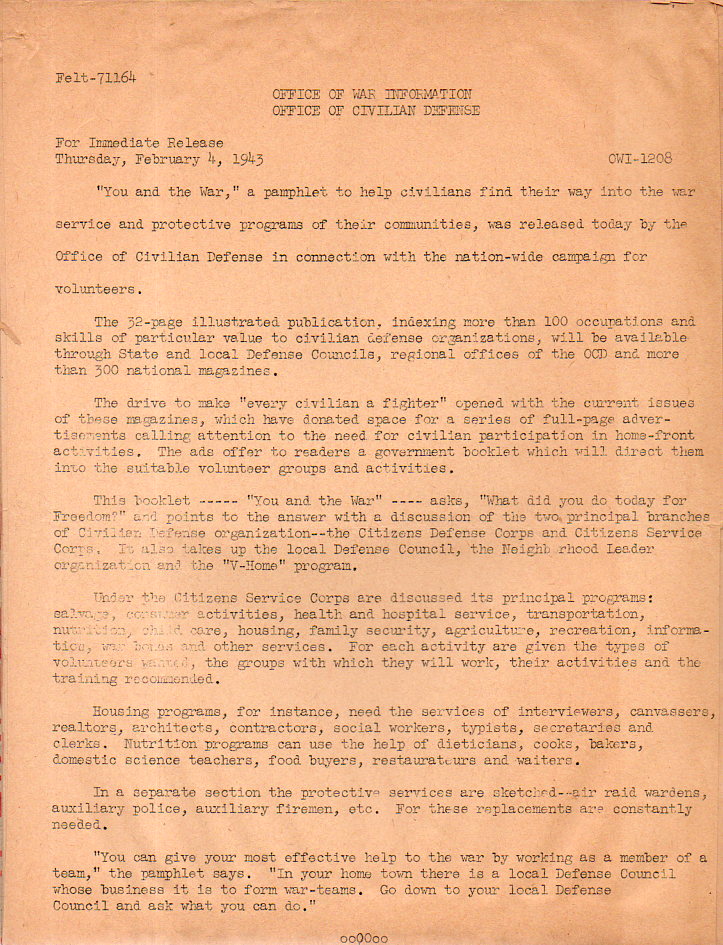 The "Civilian Protection Jobs" on notice and advised in this pamphlet included calls to citizens for: command section (3 per 1,000 population, 20 hours training); Drivers Corps (5 per 1,000, 38 hours of training); Messengers, (8 per 1,000, 20 hours of training); rescue squad (2 per 1000, 40 hours of training); auxiliary police (4 per 1000, 23 hours of training); auxiliary firemen (4 per 1000, 27 hours of training); fire watchers (15 per 1000, 10 hours training); demolition and clearance units (2 per 1000, 10 hours of training); decontamination units (1 per 1000, 20 hours of training); emergency welfare units (1 per 1000, 7 hours of training). There is also an index for another hundred or so jobs that needed to be filled in time of national emergency.
