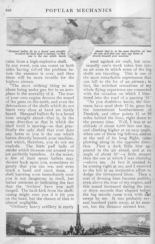 This interesting graphic appears in the article "Airmen's Sensations in Battle" in Popular Mechanics, November 1916. It hows a cross-section, of sorts, of an air battle with antiaircraft involvement, and to my experience is of a very unusual design. The author writes of being chased by Fokkers and then met by "Archie" (British slang for antiaircraft guns) fire from below. Overall it is an effective design that heightens the sense of the story.