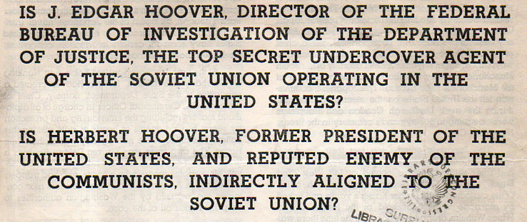 My copy of this document was once owned by H.L. Mencken, who gave the thing to the Library of Congress, which in turn decided it wasn't worth having around (at least in duplicate). I don't need to own it either, though as a piece of quiet-ish political junk it should be somewhere to remind people that even in flaming propagandistic rhetoric there's more reading to be done between the lines.