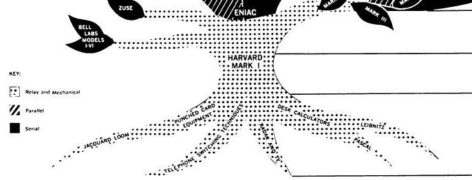 I've found a supplement for computer tree above. . The new one is interesting and has its differences from its predecessor, and divides its generations of computers in terms of logic technology. It is found in a 1960 NSF pamphlet called "The Family Tree of Computer Design", a Brief Summary of Computer Development, and I found its reference in a good book by I.B. Cohen, Howard Aiken, Portrait of a Computer Pioneer, published by MIT and available here.