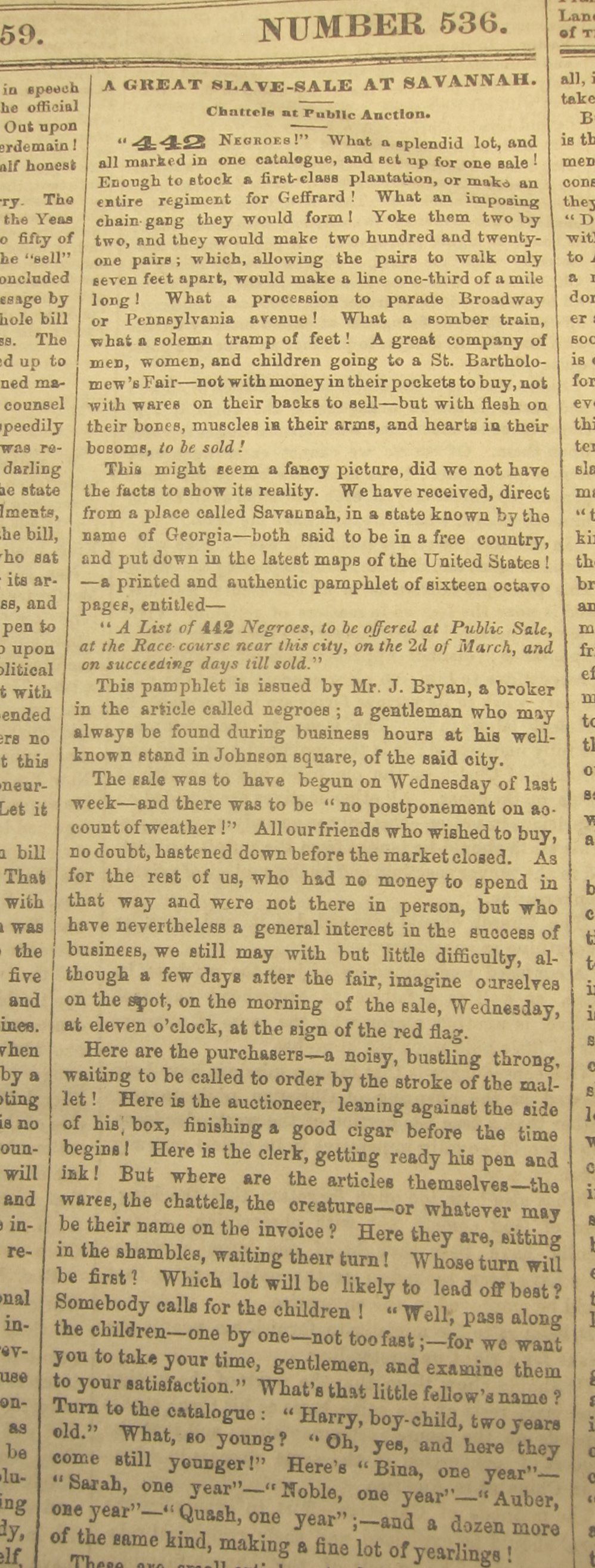 The article, “The Great Slave Sale at Savannah2”(the sale itself also referred to as “the Weeping Time”) appeared on 10 March 1859, about a week after the two-day event was held in a driving rain at the Ten Broeck Race Course, about two miles west of downtown Savannah. The slaves were the “property” of Pierce Mease3 (1810-1867), a profligate Georgia aristocrat who led himself to ruin, the slave sale intended to restore his economic condition. The sale was held at a race track