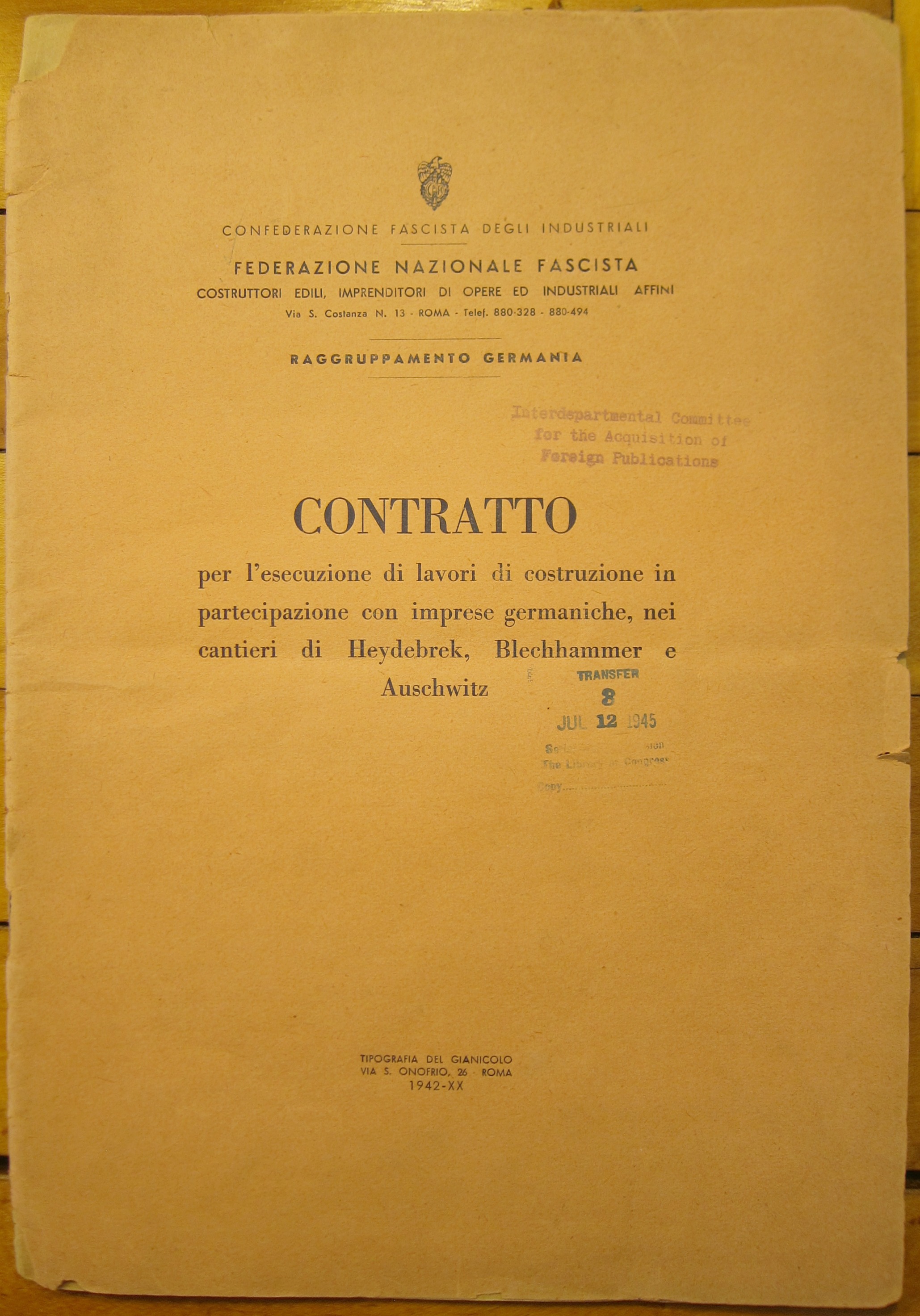 This seemingly innocuous 1942 pamphlet is an outline of agreements for a contract of labor. The people contracting the work is IG Farben, and the laborers are "foreign worker" Italians (represented by the Confederazione Fascista degli Industriali), and the work to be completed is the Buna Works at Auschwitz (part of a vast complex of slave labor, industry, and death, constituted by as many as supporting camps), as well as other work at the forced labor camps at Heydebrek and Blechhammer.