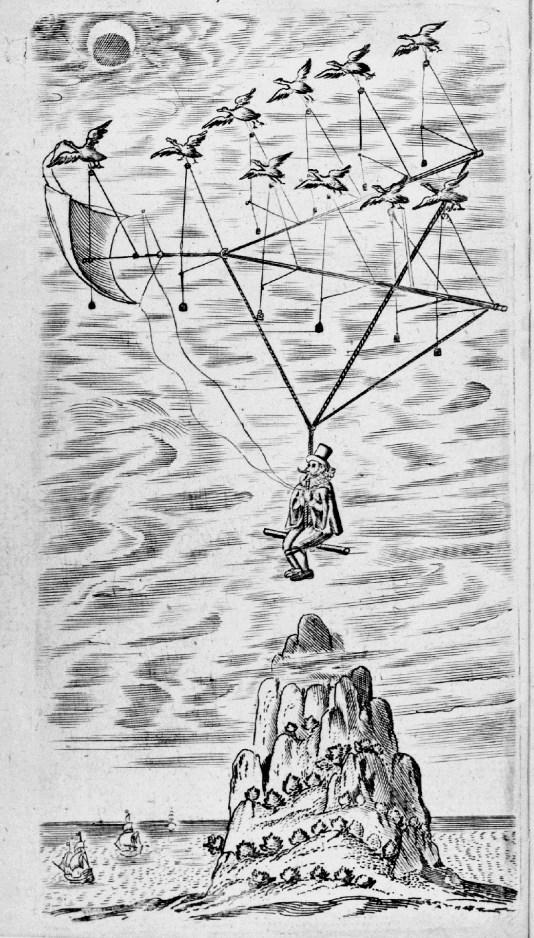 Godwin's book is short and quick, deceptively simple but not so—there's a bit of introduction where we are shown a little bit of the influence of Galileo's Sidereus (1610), and the frontis depicts the flying machine by which the intrepid traveler, Senior Gonsales flies off to the Moon. This is a craft powered by a sort of wild swan, which struggles mightily to free itself of the Gilbertian great magnet, but once free of that, the “flight” took twelve days. Our traveler may also be the first one to get to the Moon by accident: he flees a fiasco in which he kills someone in a duel winds up in St. Helena, and then has a problem with the British fleet off Tenerife, from which he flies off again with his bird machine...he hadn't intended to go to the Moon, but that is what happened.