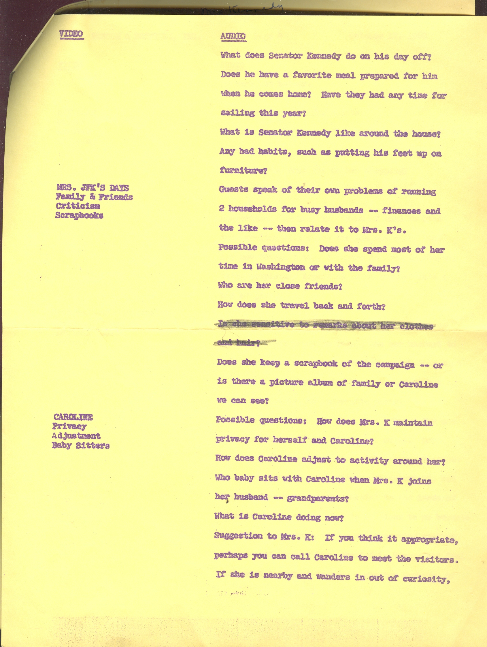 AUDIO (pg 2): "Other possible questions: how do the Kennedys keep in touch during campaign (any interesting or unusual notes or phone messages)?". Other questions put to Jackie: --what does Senator Kennedy do on his day off? --does he have a favorite meal? --how does Mrs K spend most of her time? --how does Caroline adjust to the activity around her? --has Mrs. K had time to fix up nursery, gather baby clothes? --where does she do her shopping? Then there is this nugget (on page 4) about a possible response for Mrs. Kennedy on her impending childbirth: "Much of what we used for Caroline will serve for the new baby, too. Any new things I buy, I choose in neutral shades, being completely impartial as to whether it's a boy or a girl".